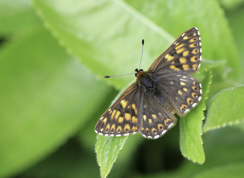 The Duke of Burgundy is a small butterfly that takes to the wing in mid-to-late spring. They can be found on chalk and limestone grasslands with some slopes or scrub to provide shelter, or sometimes in woodland with large rides, glades and clearings. Their numbers have crashed in recent decades. Since the 1980s, their distribution has shrunk by around 89%; they are now only found in a few parts of England.Males are very territorial. They defend small, sunny patches a few metres wide. They'll often perch on a plant, waiting to chase off rivals or follow any females that fly by. After mating, females flutter from foodplant to foodplant, laying their eggs on the undersides of leaves.